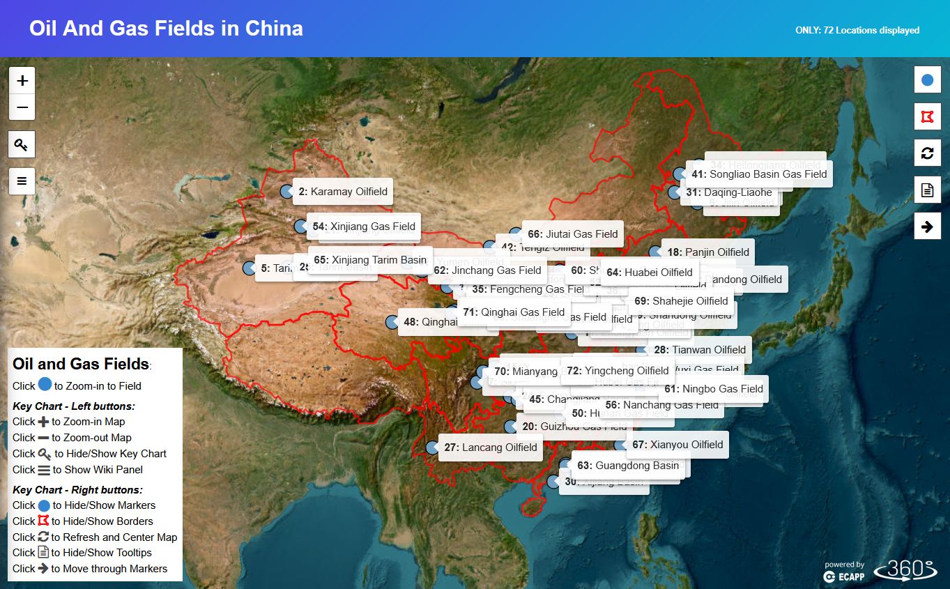 Oil and Gas Fields in China: Click to Zoom-in to Field | Key Chart - Left buttons: | Click to Zoom-in Map | Click to Zoom-out Map | Click to Hide/Show Key Chart | Click to Show Wiki Panel | Key Chart - Right buttons: | Click to Hide/Show Markers | Click to Hide/Show Borders | Click to Refresh and Center Map | Click to Hide/Show Tooltips | Click to Move through Markers.